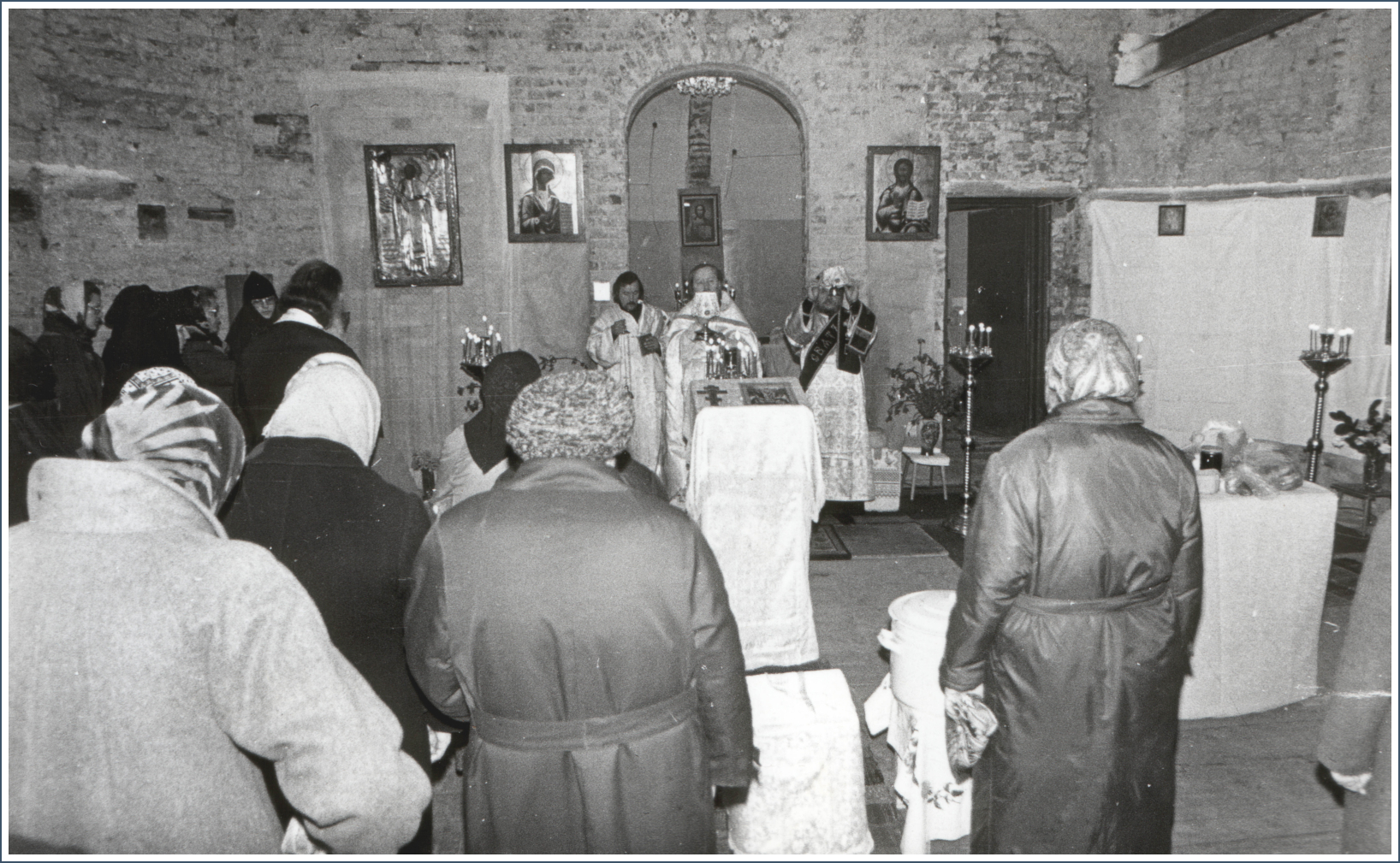 Тогда кладка поддалась и алтарный проем был освобожден. На следующий день, 25 апреля 1995 г., на Пасху, в Казанской церкви была совершена первая после 75-летнего периода осквернения святыни литургия. Это богослужение в полуразрушенном храме совершил один из старейших клириков Пермской Епархии протоиерей Николай Тетерин.